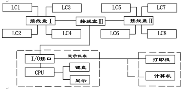 承載貨車進(jìn)入秤臺(tái),在物體重力作用下,使稱重傳感器彈性體產(chǎn)生形變,粘貼于彈性體上的應(yīng)變計(jì)橋路阻抗失去平衡,輸出與重量數(shù)值成比例的電信號(hào),經(jīng)稱重儀表的放大器、A/D轉(zhuǎn)換器等將模擬信號(hào)轉(zhuǎn)換成數(shù)字信號(hào),再由儀表的微處理機(jī)(CPU)對(duì)重量信號(hào)進(jìn)行處理后直接顯示出重量等數(shù)據(jù)。如果顯示儀表與計(jì)算機(jī)、打印機(jī)連接,儀表可同時(shí)把重量信號(hào)輸給計(jì)算機(jī)等設(shè)備組成稱重管理系統(tǒng)。八只傳感器秤的系統(tǒng)原理圖:見圖2。