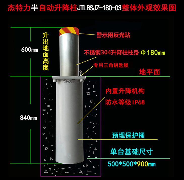 3、警示方式:升降柱的表面有50mm的反光識別帶作為警示,能夠被過往車輛的駕駛員明顯識別。
